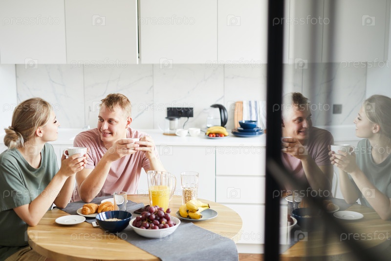 Молодые отдохнувшие супруги, получающие бранч и чай на кухне