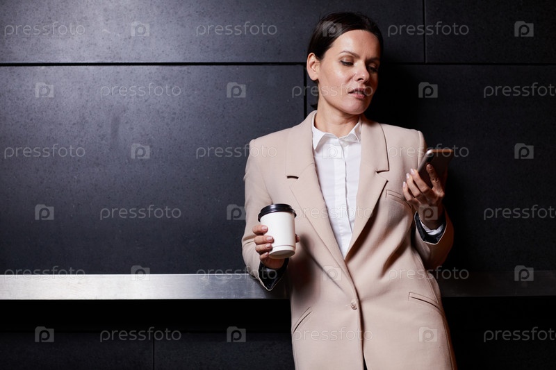 Вдумчивая элегантная бизнес-леди средних лет в модном куртке, опирающаяся на перила в темном фойе и используя смартфон во время питья кофе