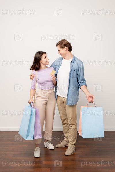 Молодая ласковая пара в повседневной одежде, несущая бумажные пакеты после покупок