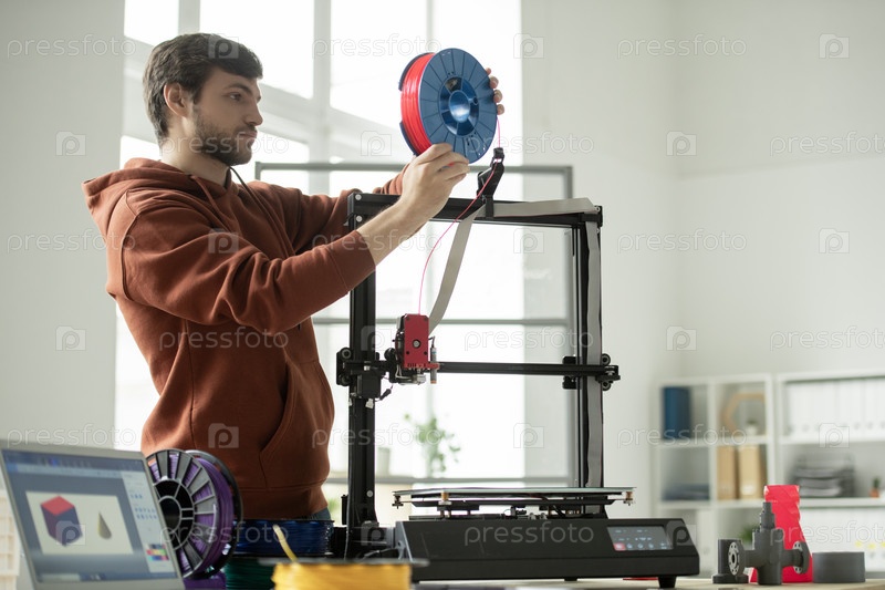 Молодой человек ставит новую катушку с красной нитью в 3D-принтер, собираясь напечатать