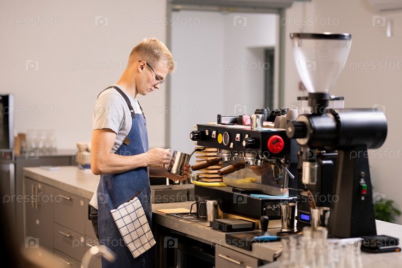 Молодой бариста стоит у кофемашины, готовя напитки для клиентов