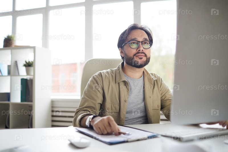 Серьезно вдохновленный молодой азиатский дизайнер с бородой, сидящий за столом и использующий компьютер во время кодирования для нового приложения