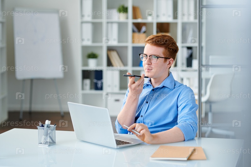 Молодой элегантный бизнесмен записывает голосовое сообщение по месту работы