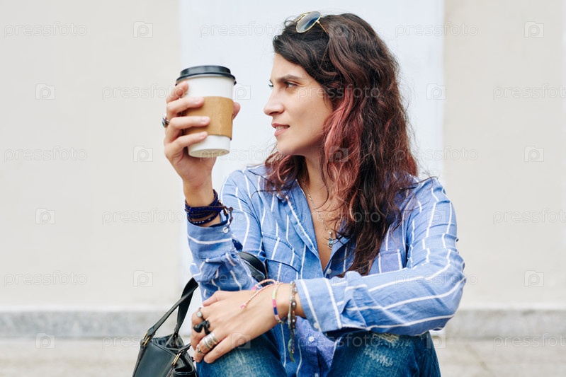 Женщина пьет кофе на свежем воздухе