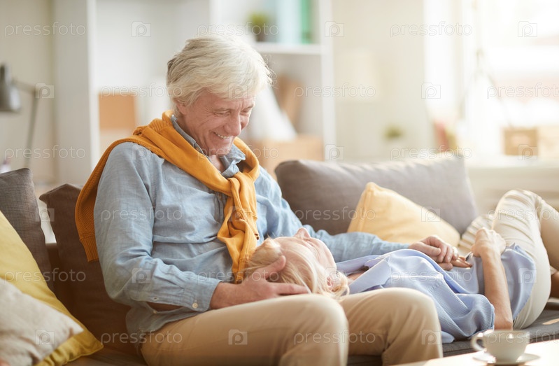 Счастливая старшая пара, лежащая на диване