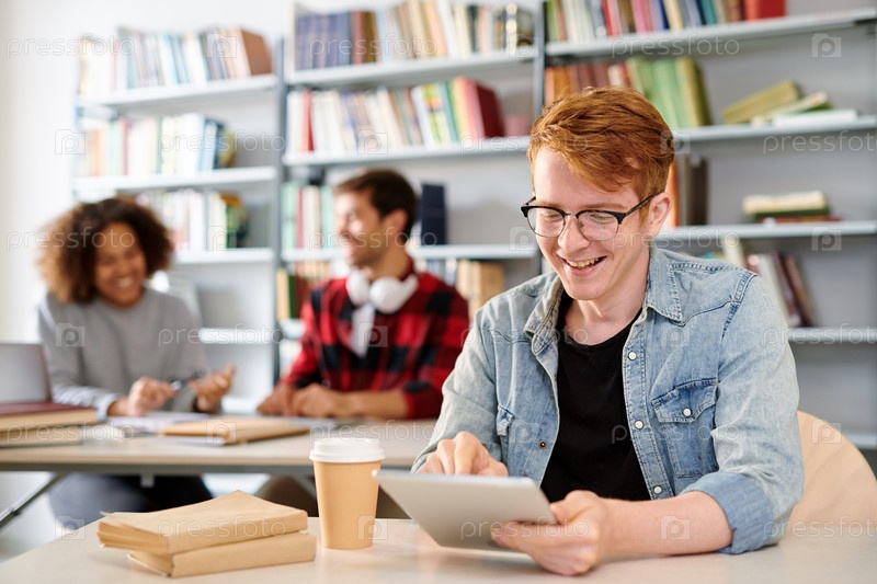 Улыбающийся случайный парень указывает на любопытные вещи на дисплее планшета