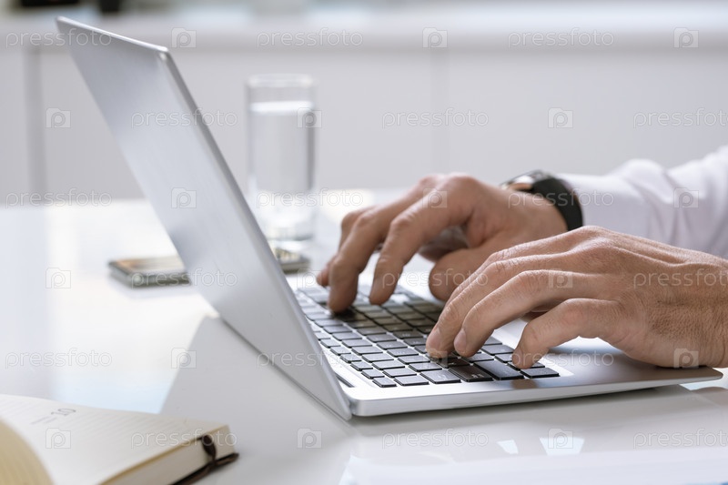 Руки современного бизнесмена или предпринимателя, касающихся клавиш ноутбучной клавиатуры