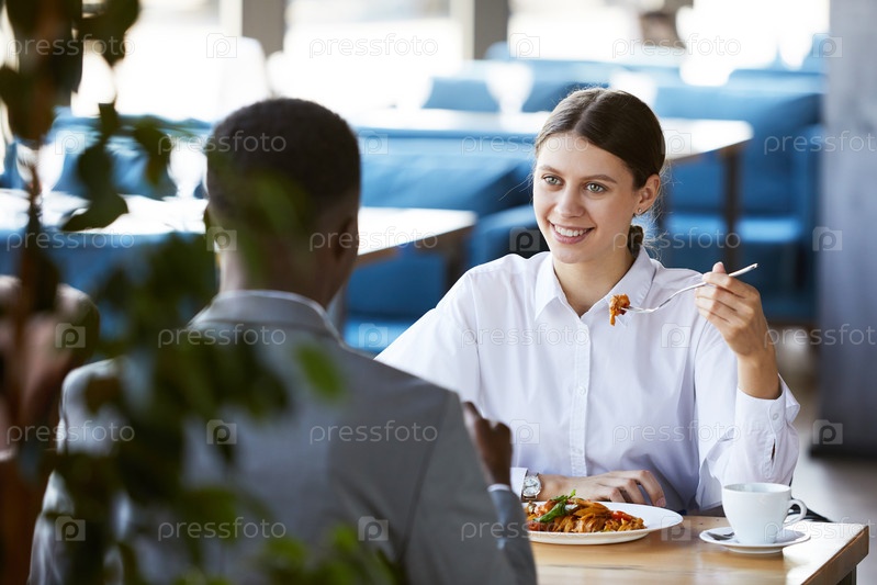 Позитивно возбужденная молодая бизнес-леди в белой рубашке сидит за столом и ест макароны во время встречи с черным руководителем в кафе