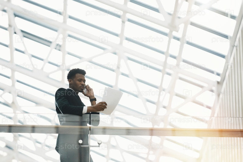 Серьезный мыслящий африканский менеджер в костюме, опирающийся на перила и просматривающий бумаги, разговаривая с клиентом по телефону о контрактных вопросах