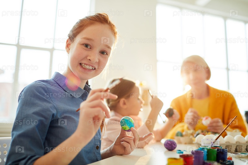 Красноволосая девушка рисует яйца на Пасху