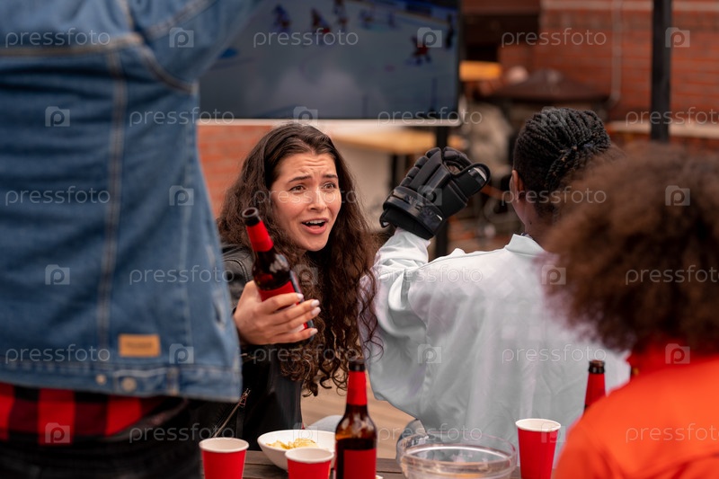Молодая женщина с пивом разговаривает со своей подругой во время трансляции матча