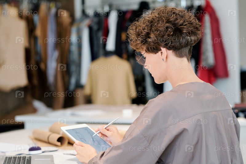 Молодой креативный дизайнер моды с планшетом делает цифровые эскизы