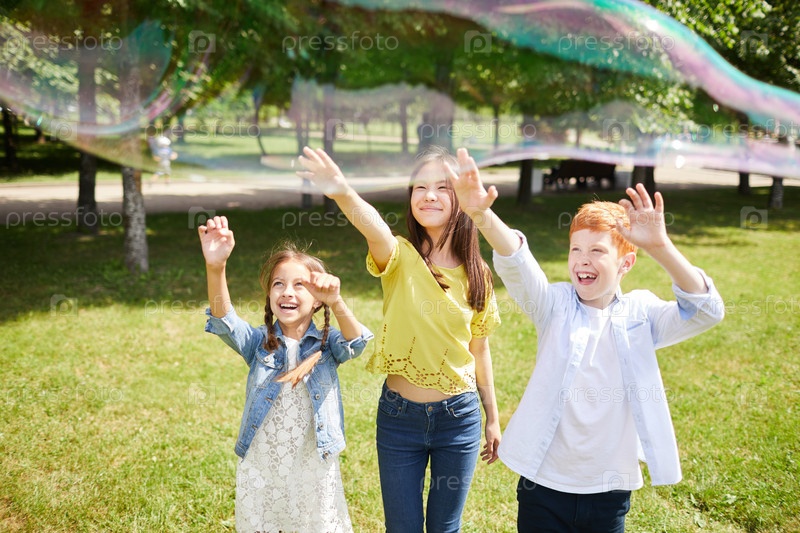 Взволнованные дети протягивают руки к мыльному пузырю