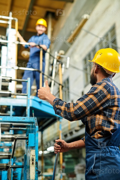 Командная работа в производственной отрасли: средневосточный работник с бородой показывает коллеге палец, когда они обмениваются информацией о процессе