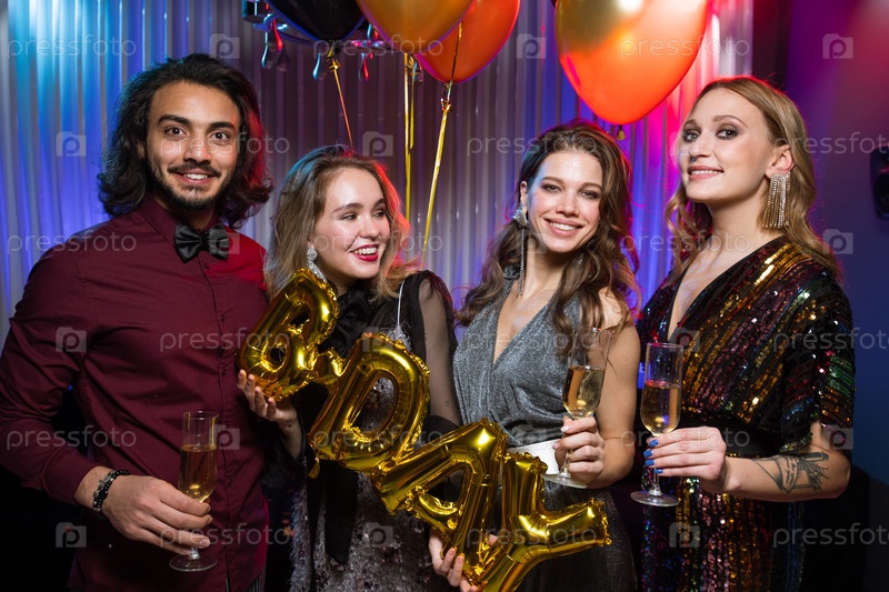 Веселые девушки и молодой элегантный мужчина, держащий флейты с шампанским и воздушными шарами