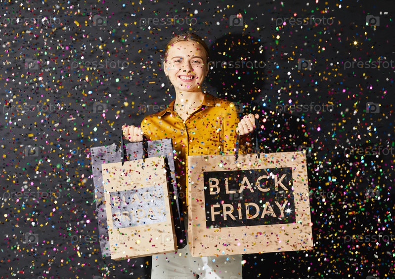 Веселая возбужденная молодая женщина в блузке, стоящая под сверкающими конфетти на черной стене на вечеринке 'Черного пятницы' и держащей сумки для покупок