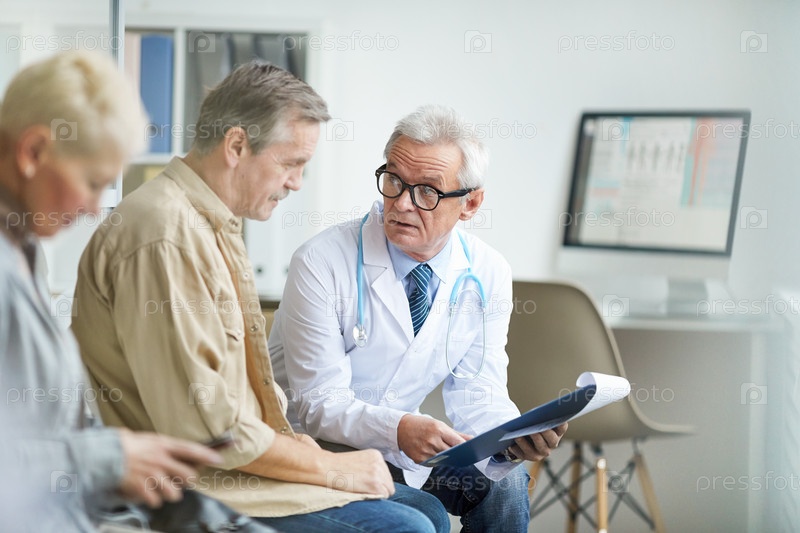 Серьезный старший врач-мужчина в белом пальто и очках, держащий доску с медицинской картой и отвечающий на вопросы пациентов