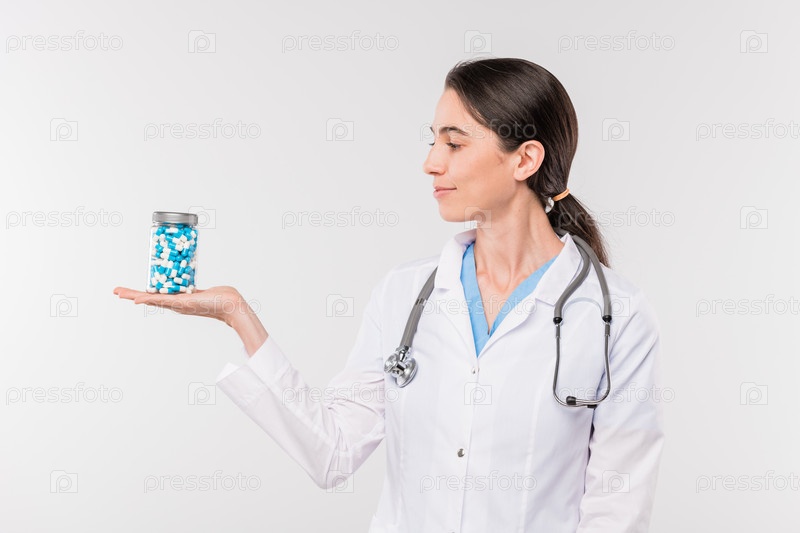 Молодая женщина-клиницист или медсестра в белом халате держит банку с таблетками под рукой