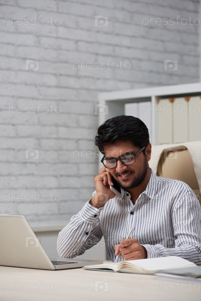 Веселый предприниматель звонит по телефону