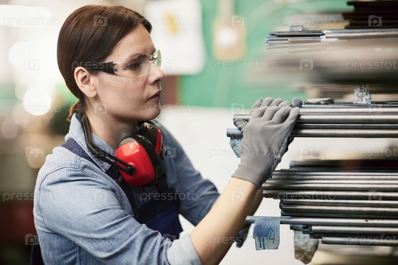 Серьезная брюнетка - заводская складская рабочая в защитных очках и перчатках, которая ставит металлические доски на полки