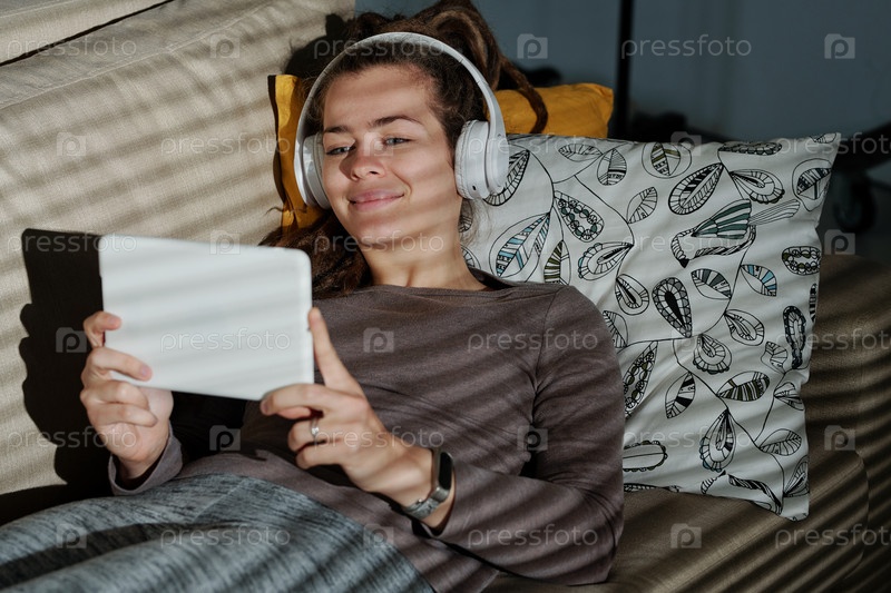 Счастливая молодая женщина отдыхает на диване, пока смотрит смешное видео