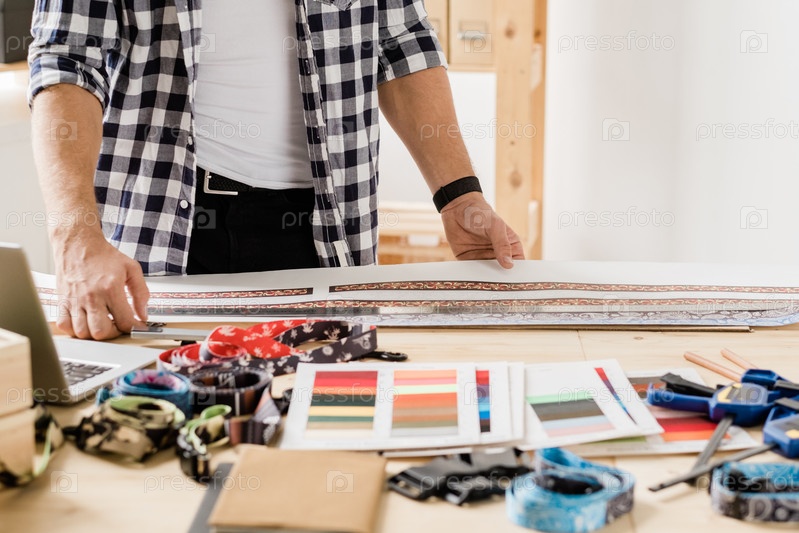 Руки современного мастера, стоящего за столом и выбирающего предмет декора