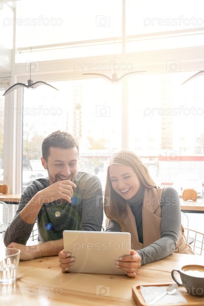 Молодая счастливая пара смеется над чем-то забавным, пока смотрит онлайн видео