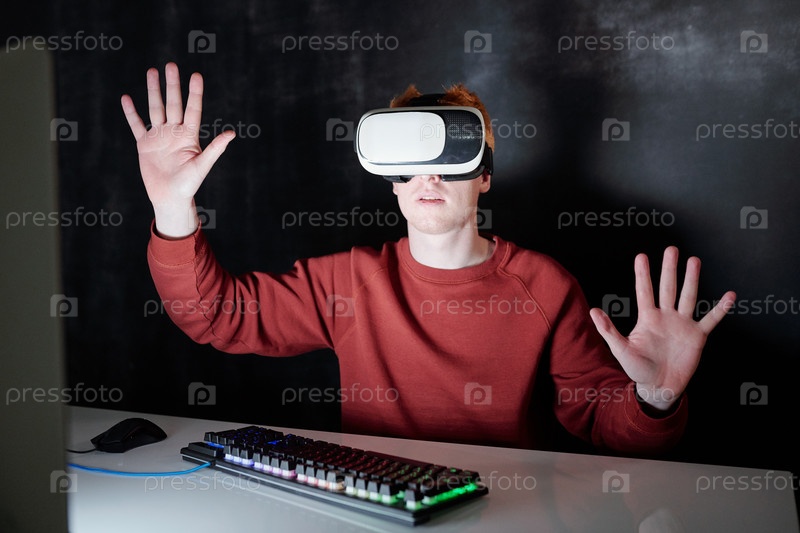 Молодой человек в VR гарнитурах сидит за столом перед виртуальным экраном компьютера