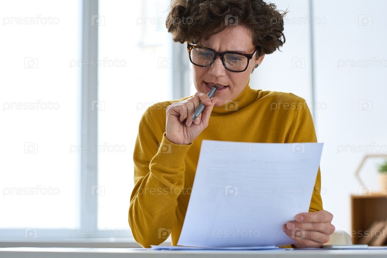 Frowning woman viewing document Нахмурившись женщина просматривает документ