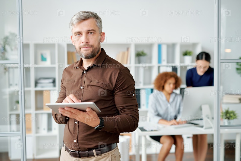 Серьезный бизнесмен в умной повседневной одежде смотрит на вас в офисной среде