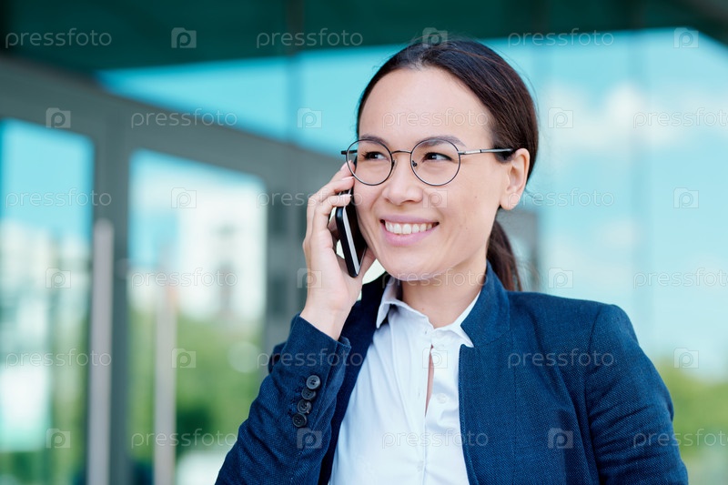 Молодая улыбающаяся брюнетка-бизнесменка обсуждает рабочие моменты на смартфоне