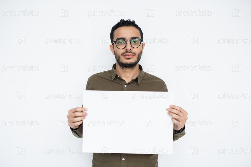 Молодой бизнесмен с пустым лицом, держащий пустой плакат для рекламы
