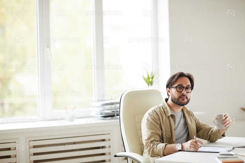 Серьезный хипстер азиатский мужчина с бородой, сидящий за столом и пьющий кофе из кружки во время работы с документами в офисе