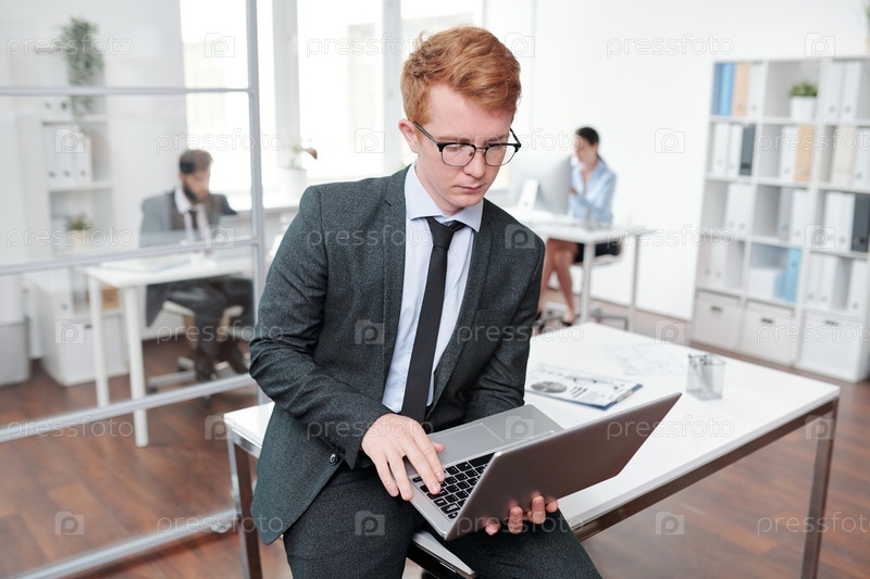Молодой рыжеволосый бизнесмен держит ноутбук