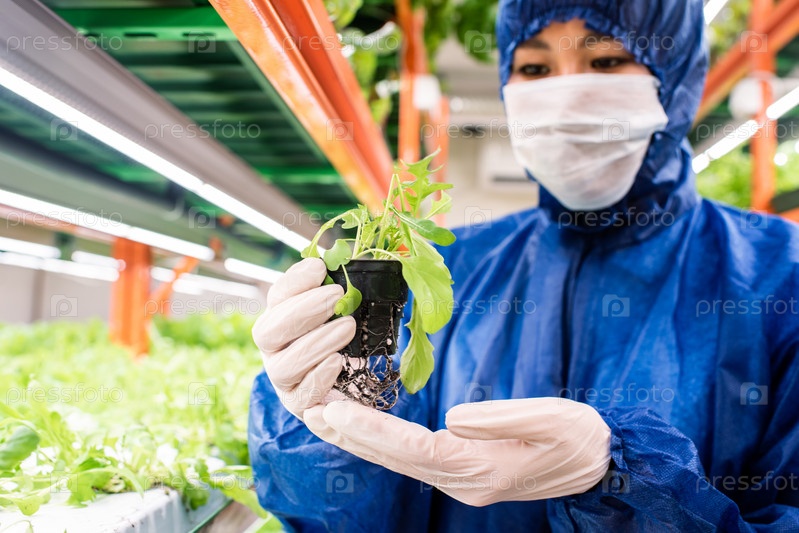 Биолог в перчатках с защитной маской и комбинезоном, держащий зеленую рассаду