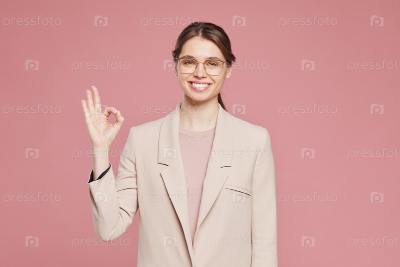 Портрет улыбающейся женщины-менеджера в очках, стоящей на розовом фоне и показывающей знак OK, имея отличное решение