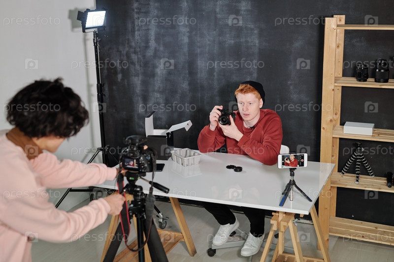 Молодой мужской влоггер в повседневном пуловере и шапке показывает свою новую камеру