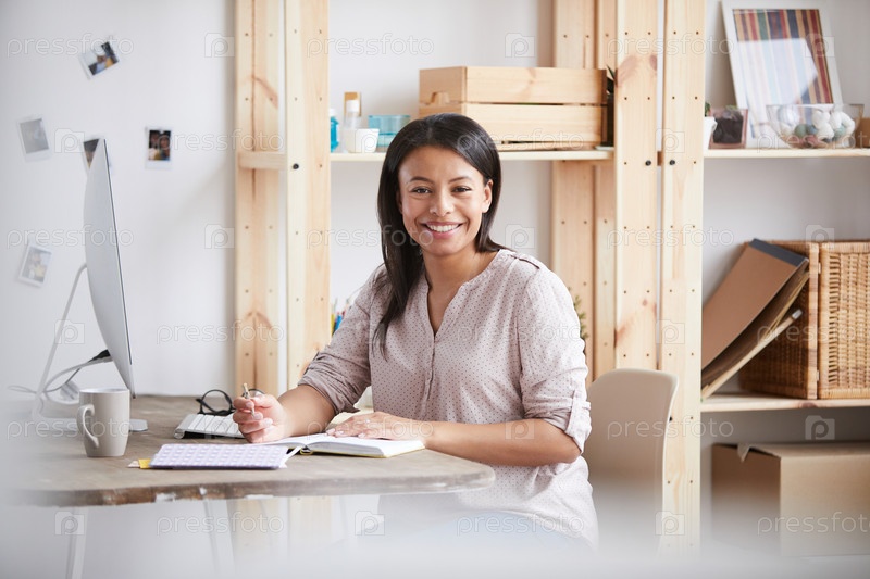Улыбающаяся женщина смешанной расы за столом