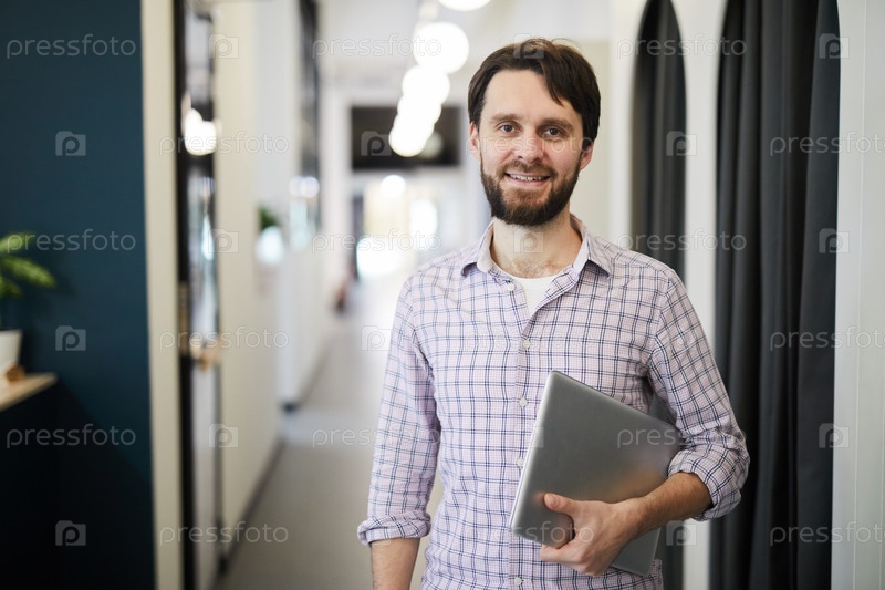 Веселый успешный предприниматель с ноутбуком