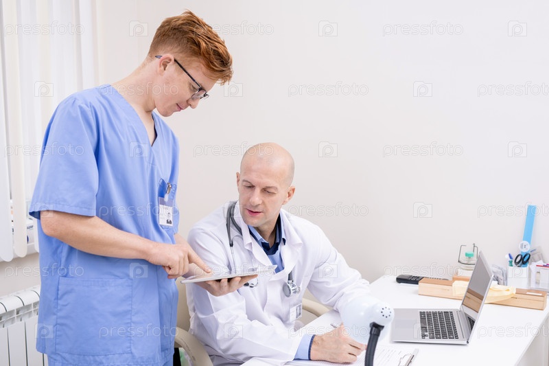 Молодой врач показывает на дисплей с сенсорной панелью, показывая данные коллеге
