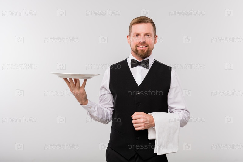 Молодой элегантный официант в черном жилете и галстуке держит белый полотенце и тарелку