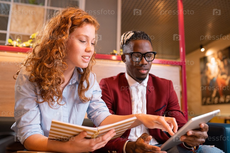 Молодые успешные мультикультурные студенты или сотрудники, которые смотрят на дисплей с сенсорным панелем