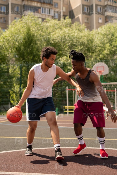 Два межкультурных товарища по баскетболу играют или тренируются на корте