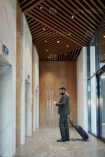 Молодой бизнесмен с чемоданом использует смартфон, ожидая лифта