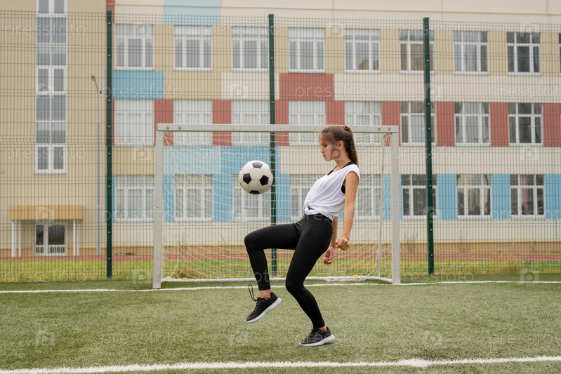 Молодая спортсменка в леггинсах, кроссовках и футболке тренируется играть в футбол