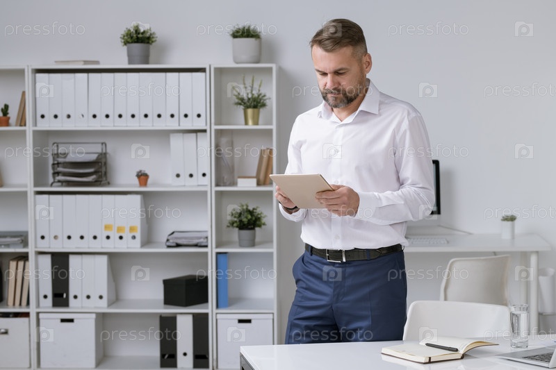 Уверенный в себе зрелый предприниматель прокручивает планшет при поиске данных