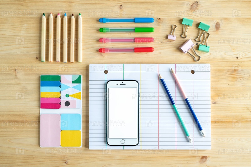 Вид на офисные или образовательные принадлежности на деревянном столе