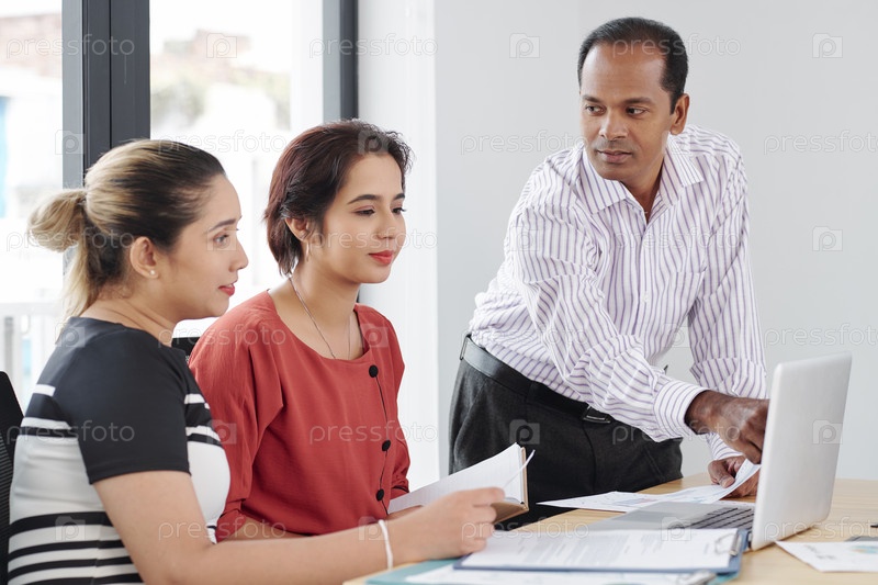 Бизнесмены работают на ноутбуке в офисе