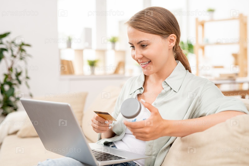 Красивая молодая женщина с пластиковой карточкой и банкой собирается сделать заказ в интернет-магазине