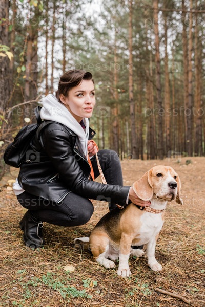 Красивая молодая брюнетка обнимает милого щенка Бигла, сидя на приседаниях